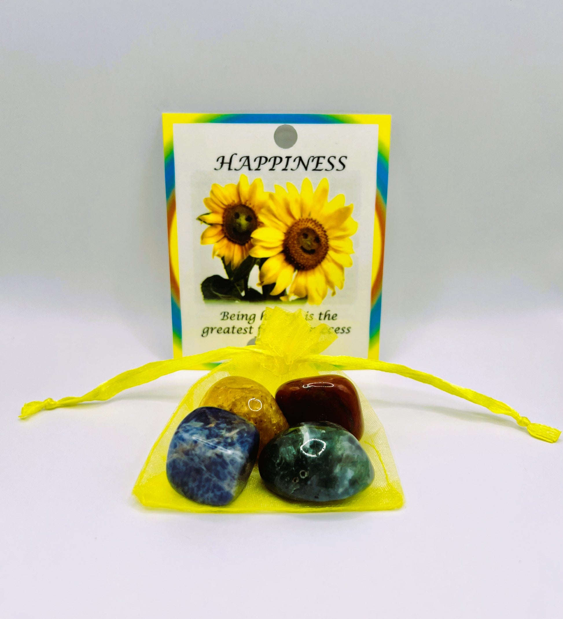 Happiness crystal healing bag has Golden Quartz, Moss Agate, Sodalite and Red Jasper to bring inner joy, peace of mind and optimism as well as feelings of exhilaration, playfulness, good spirits and laughter.
