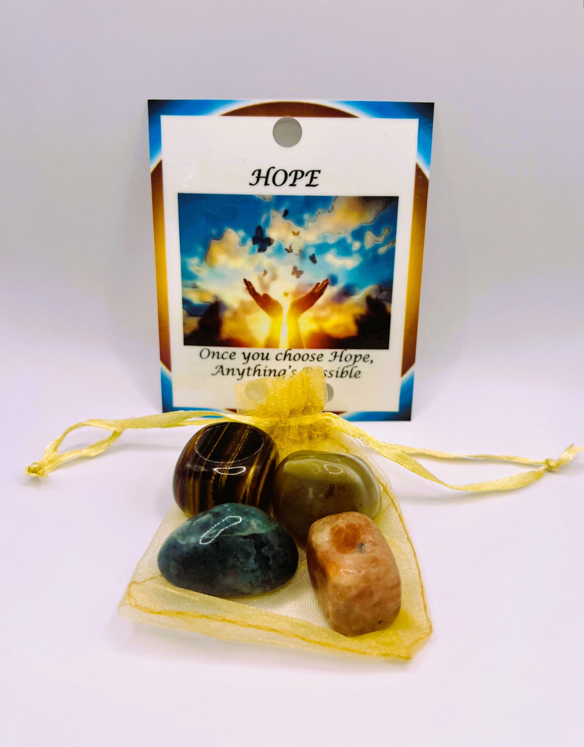 Hope crystal healing bag has Indian Agate, Moss Agate, Sunstone and Tigers Eye to encourage inner growth and strength. They help you to acheive your goals and promote new beginnings.