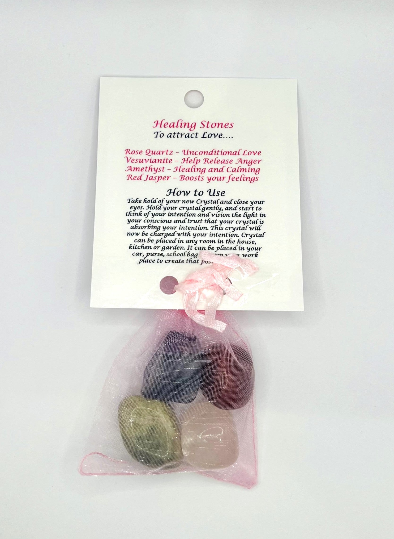 Love crystal healing bag has Amethyst, Red Jasper, Rose Quartz and Vesuvianite crystals to bring inner peace in relationships. These crystals are for self-love, empathy, and improving your communication skills.