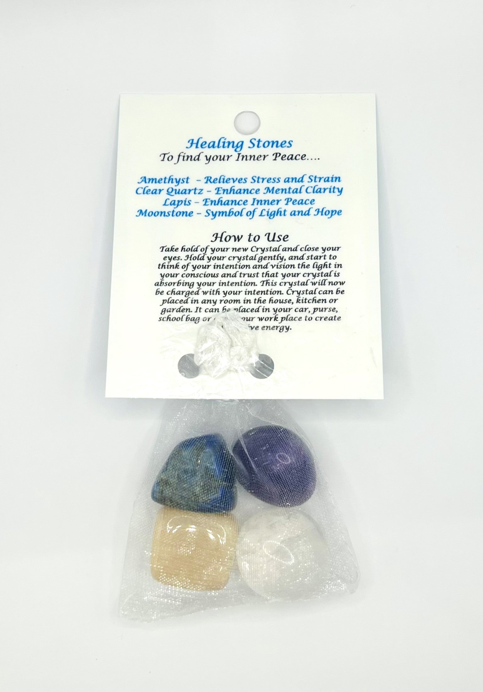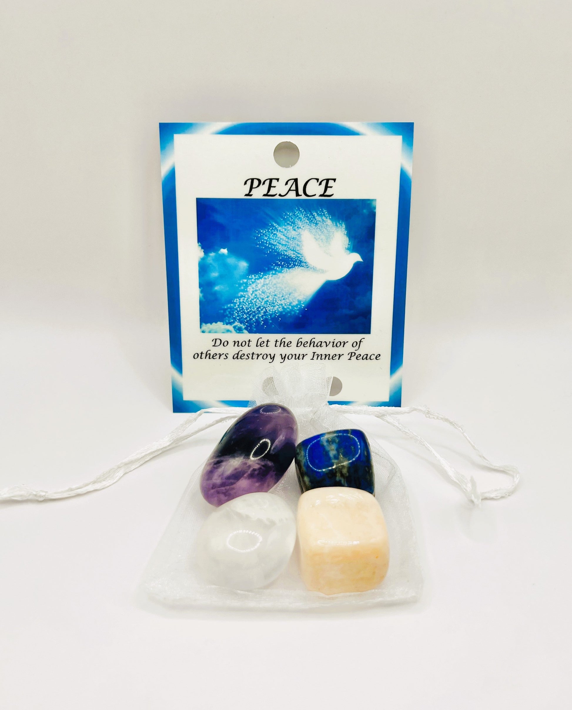 Peace crystal healing bag has Amethyst, Clear Quartz, Lapis and Moonstone to remove the negative energy and bring you Inner Peace.