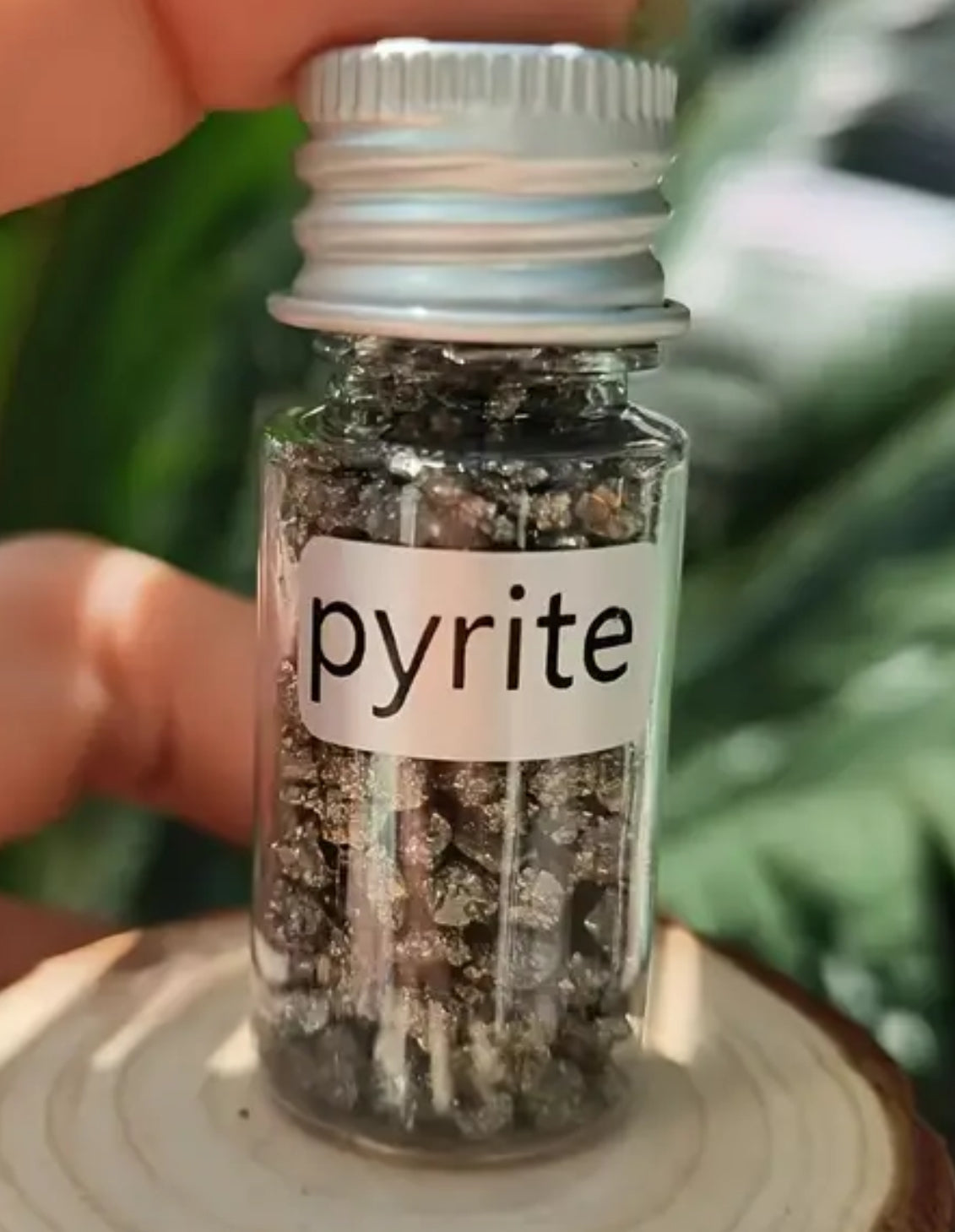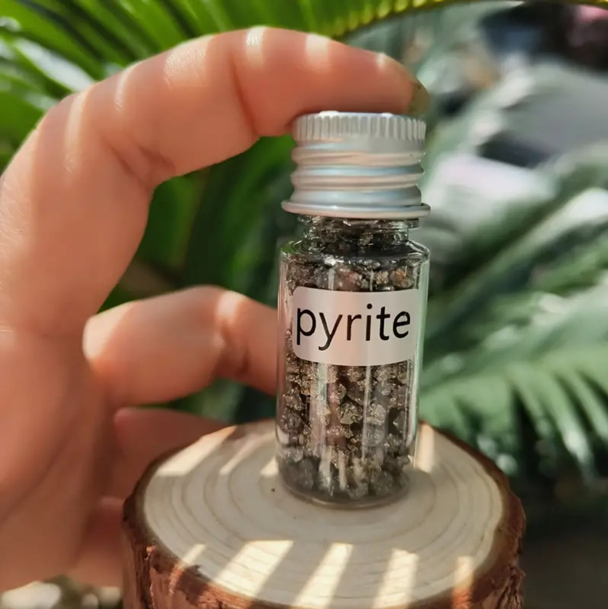 This Pyrite crystal gemstone bottle is a compact and charming container filled with small pyrite crystals, often referred to as "fool's gold" due to their striking resemblance to gold. These bottles are believed to hold metaphysical properties. Pyrite is thought to attract abundance, prosperity, and good luck, while also providing protection from negative energy. The small size of the bottle makes it perfect for carrying in a pocket or placing in a workspace to enhance motivation, confidence, and mental clarity.