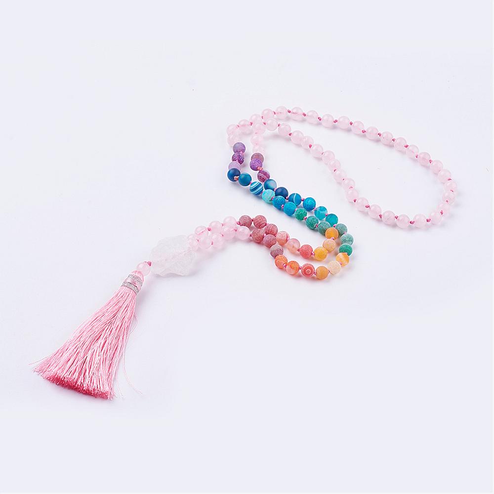 A beautiful Rose Quartz long beaded necklace (Japa Mala - 34.6 Inch) with chakra weathered agate and clear quartz crystal. Rose Quartz is a stone of unconditional love. It can heal relationships by enhancing understanding and peace. Its delicate charm and soothing color give a calming effect. Chakra color weathered agate are excellent stones for rebalancing and harmonising the body, mind and spirit. They cleanses and stabilises the aura, eliminating and transforming negativity with Clear Quartz Crystal which has the ability to provide clarity and manifestation of dreams into reality.